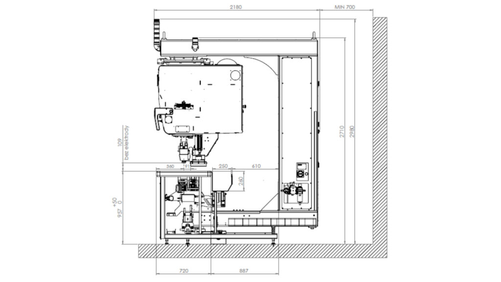 Maszyna instalowana jest w specjalnym zagłębieniu poniżej poziomu posadzki hali, dzięki czemu powierzchnia robocza znajduje się na poziomie podłogi. Takie rozwiązanie znacząco ułatwia operowanie dużymi i ciężkimi materiałami oraz wyraźnie poprawia ergonomię pracy operatora.