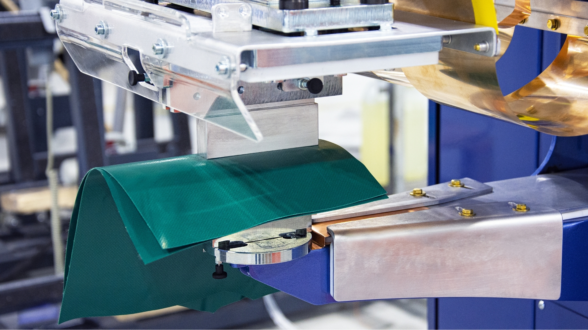 Głowica z obracanym uchwytem elektrody – łączy funkcjonalność zgrzewów prostych z możliwością formowania materiału w tuby lub rękawy po obróceniu uchwytu.